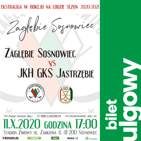 Bilet ulgowy* uprawnia do wejścia na mecz Zagłębie Sosnowiec - JKH GKS Jastrzębie, który odbędzie się Na Stadionie Zimowym przy ul. Zamkowej 4 w Sosnowcu w niedzielę 11 października 2020 roku o godzinie 17:00.